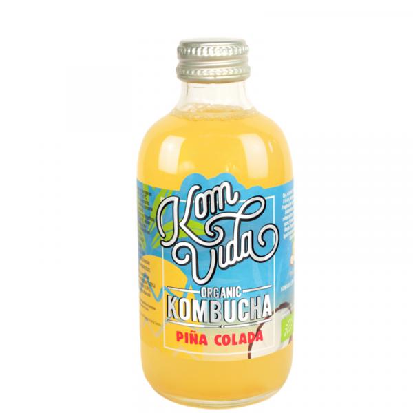 La kombucha de piña colada de Komvida es una bebida original de kombucha a base de té verde, ecológica, probiótica y muy beneficiosa para tu salud y para el funcionamiento de tu sistema inmunológico. Es una gran fuente de antioxidantes, repuebla la flora intestinal, equilibra el metabolismo y por tanto, ayuda a la pérdida de peso y es revitalizante